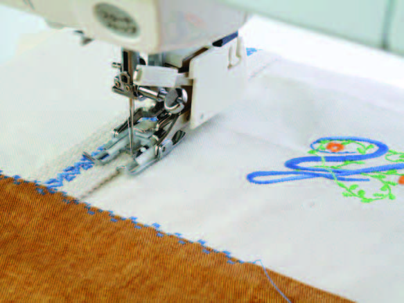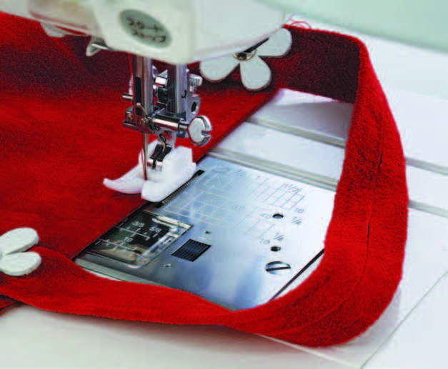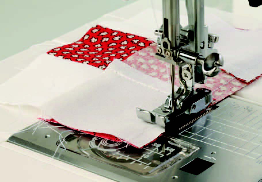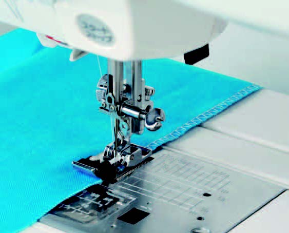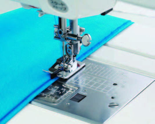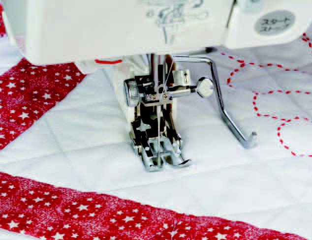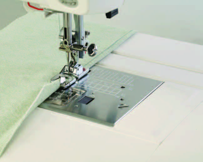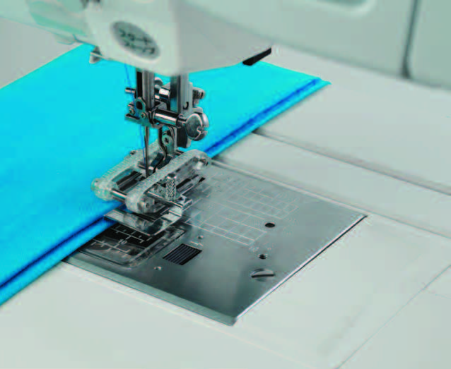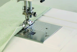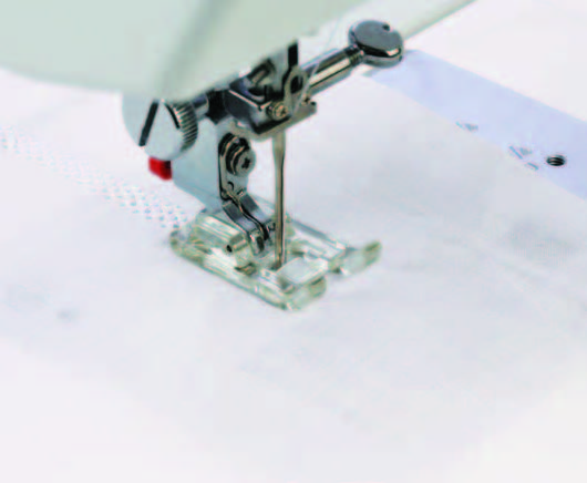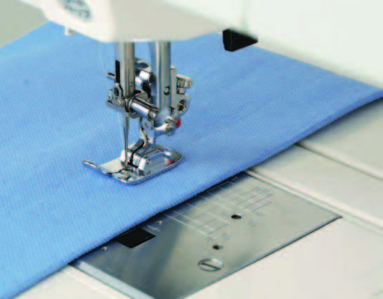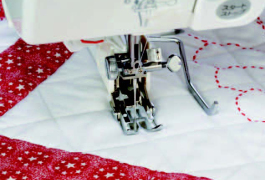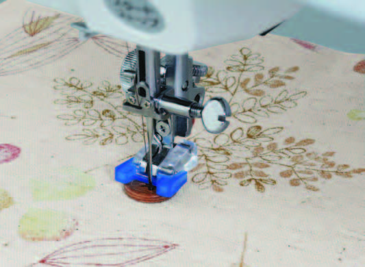 Patka pro rovnoměrné podávání kráčí po látce a napomáhá rovnoměrnému podávání. S touto patkou můžete šít bez krabacení látky, neboť zoubky podavače uchopují látku shora i zdola. K dokonalému vedení rovnoběžných švů či k udržení stejné šířky přesahu švu použijte quiltovací vodítko.