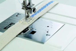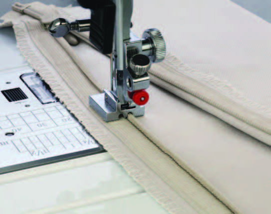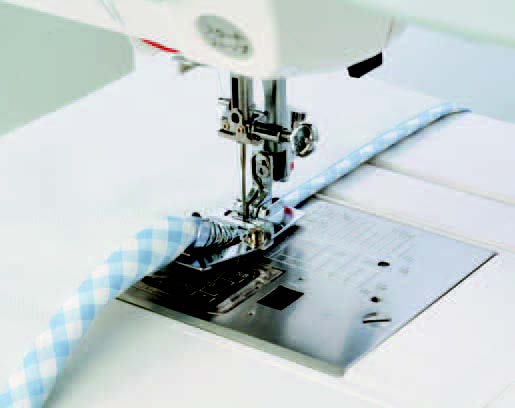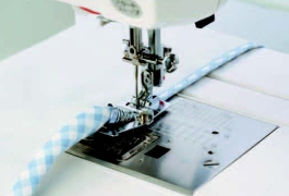Tato patka se používá k našití předem složeného šikmého proužku nebo šikmého proužku, který jste si sami ustřihli, k okraji látky, v jediném snadném kroku. Patka je vybavena malým trychtýřkem, který skládá a vede šikmý proužek na okraj látky ještě před jehlou. Patku můžete použít jak s entlovacím či ozdobným stehem, tak s rovným stehem. Použít můžete proužek šířky 10 až 14 mm.